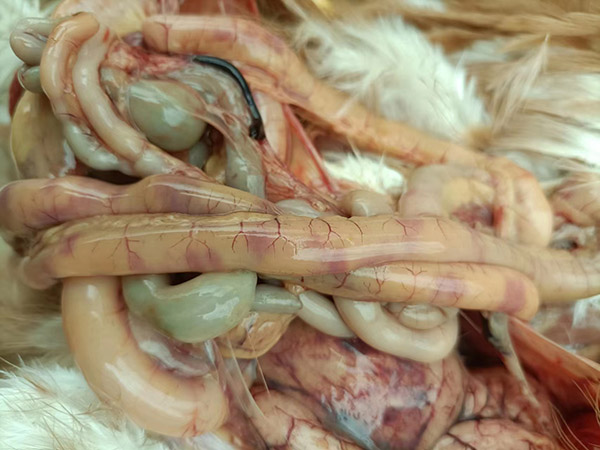 解剖整個(gè)小腸腸壁變薄,布滿豆粒大小出血斑,內(nèi)容物稀薄,腺胃乳頭發(fā)暗,肝臟顏色變淺,輸卵管內(nèi)有一枚成型雞蛋。