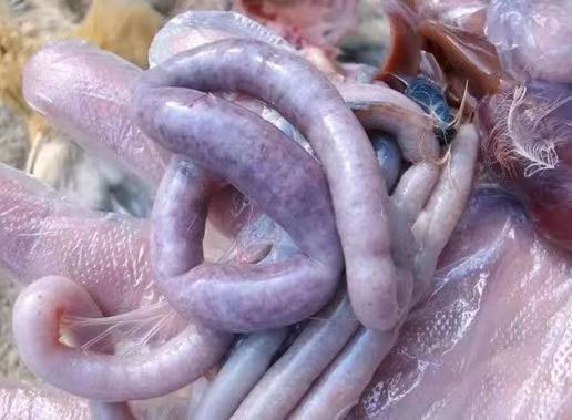 剖檢可見病死雞全是肌肉蒼白,十二指腸腫脹,盲腸腫大出血,肝臟腫大顏色變淡。